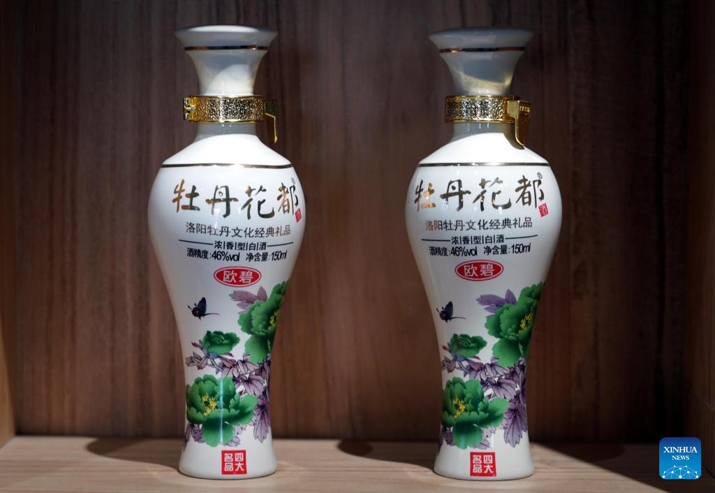This photo taken on April 16, 2024 shows alcoholic products in peony-themed bottles at Peony Pavilion in Luoyang, central China's Henan Province. As an imperial capital during 13 dynasties, Luoyang claims to have the country's best peonies. In recent years, Luoyang has actively explored the culture related to peony flowers, encouraging the development of peony-themed porcelain, painting, and many other characteristic activities containing peony elements. This enables tourists to enjoy both the flowers and the vibe of this ancient capital. (Xinhua/Li An)