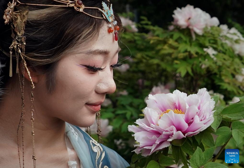 A tourist in traditional Chinese attire enjoys peony flowers at the China National Flower Garden in Luoyang, central China's Henan Province, April 16, 2024. As an imperial capital during 13 dynasties, Luoyang claims to have the country's best peonies. In recent years, Luoyang has actively explored the culture related to peony flowers, encouraging the development of peony-themed porcelain, painting, and many other characteristic activities containing peony elements. This enables tourists to enjoy both the flowers and the vibe of this ancient capital. (Xinhua/Li An)