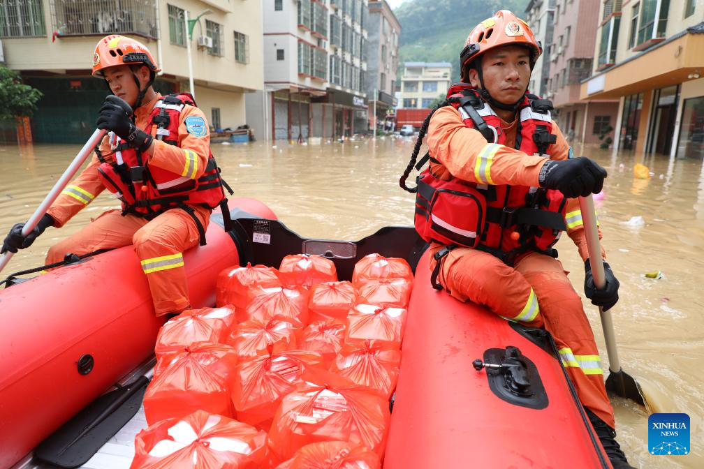 Rescuers are on their way to deliver food to people affected by the heavy rainfall in Lianjiangkou town, Yingde city of South China's Guangdong province, April 22, 2024. [Photo/Xinhua]
