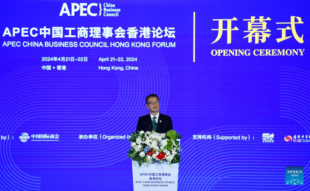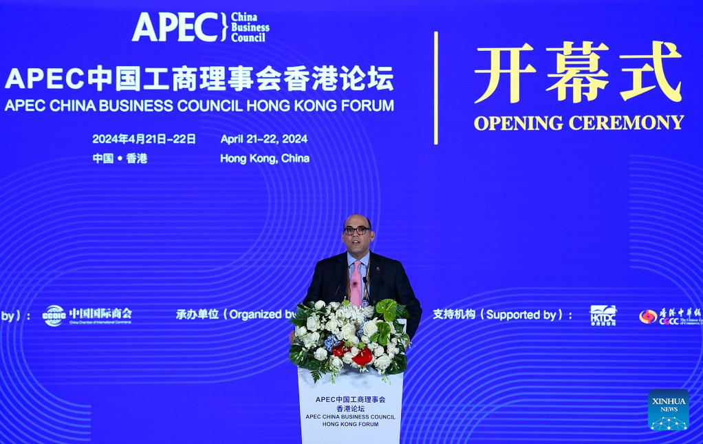 Paul Chan, financial secretary of the Hong Kong Special Administrative Region (HKSAR) government, addresses the opening ceremony of the APEC China Business Council Hong Kong Forum in Hong Kong, south China, April 22, 2024. The APEC China Business Council Hong Kong Forum opened on Monday in Hong Kong with participants discussing the stabilizing and smoothing of global industrial and supply chains and promoting sustainable development. (Xinhua/Chen Duo)