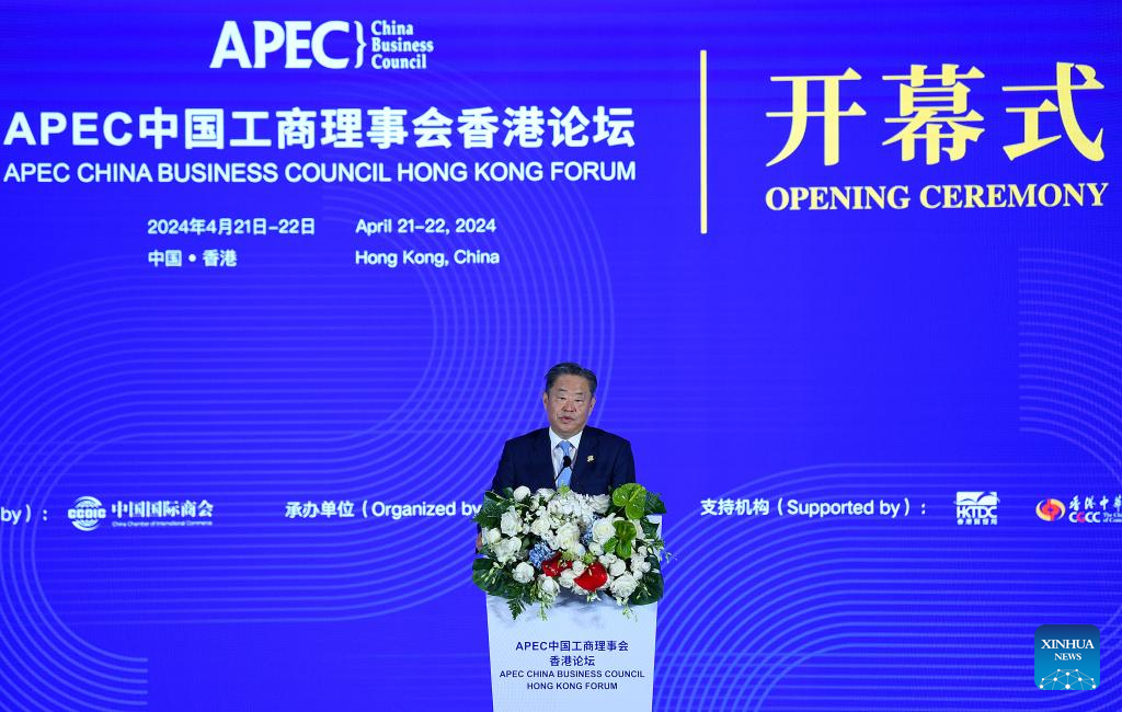 Ning Gaoning, chairman of APEC China Business Council, addresses the opening ceremony of the APEC China Business Council Hong Kong Forum in Hong Kong, south China, April 22, 2024. The APEC China Business Council Hong Kong Forum opened on Monday in Hong Kong with participants discussing the stabilizing and smoothing of global industrial and supply chains and promoting sustainable development. (Xinhua/Chen Duo)