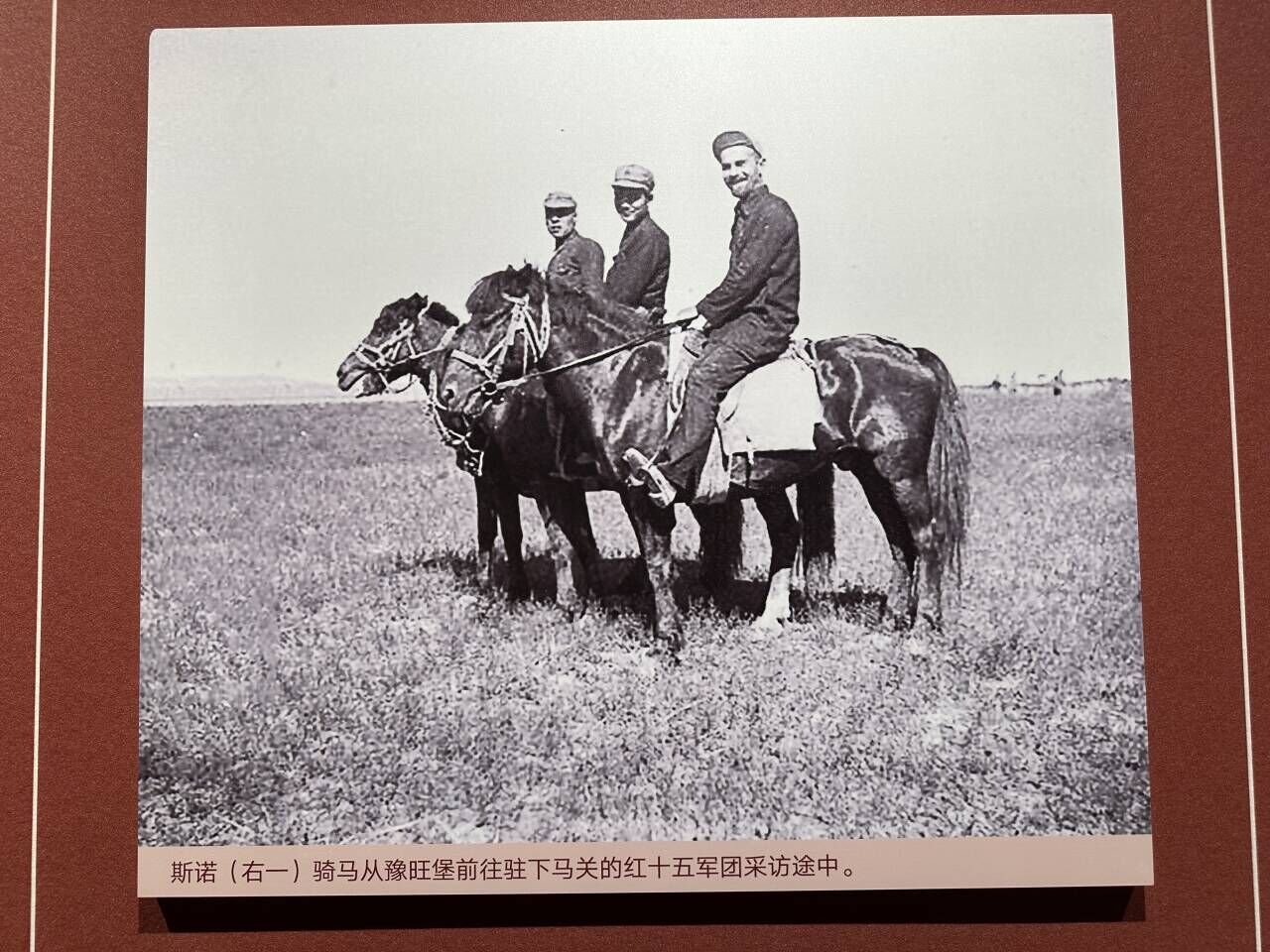 Edgar Snow (the first from right) is on his way from Yuwang town to Xiamaguan town where the Fifteenth Army Group of Chinese Workers' and Peasants' Red Army was stationed for an interview. (Photo / People's Daily Online)