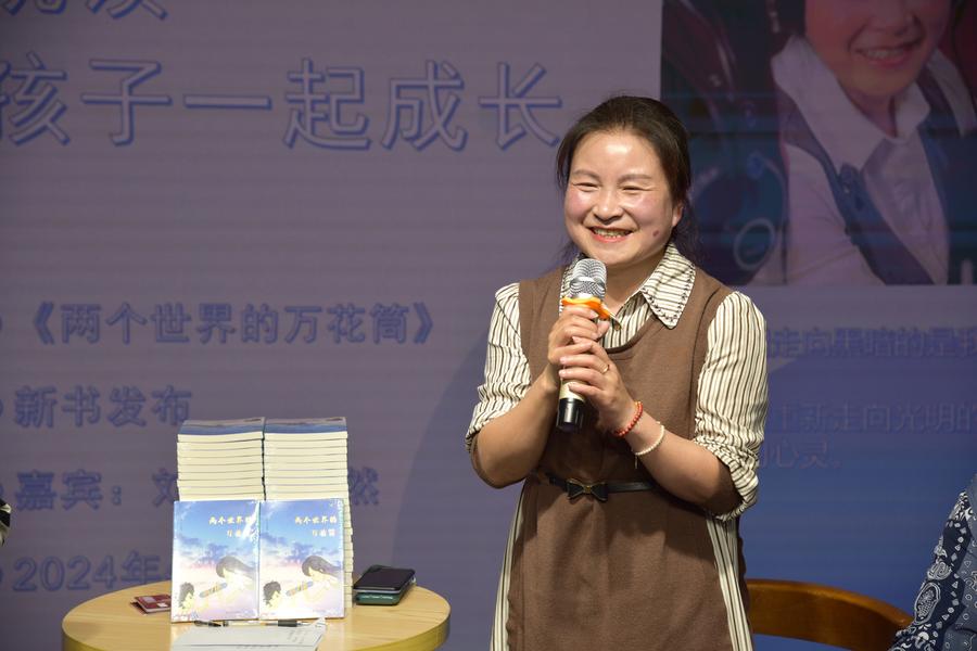 Liu Fang, a visually impaired teacher from Guiyang, shares her stories about reading in Guiyang, southwest China's Guizhou Province, April 20, 2024. (Xinhua/Luo Fei)
