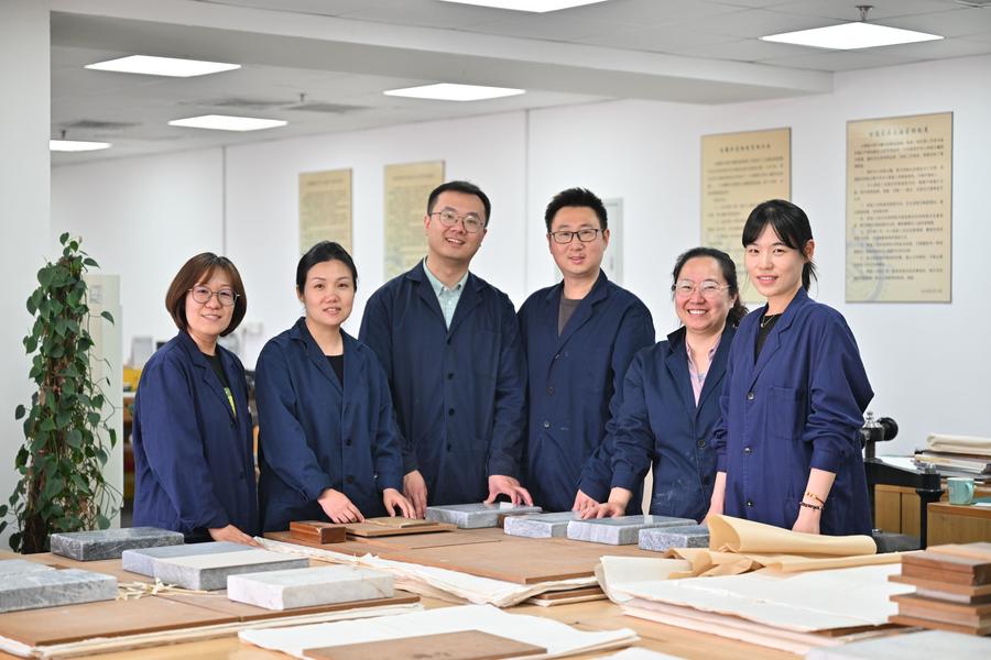 Gao Xuemiao (3rd L) poses for a group photo with his colleagues at Tianjin Library in north China's Tianjin Municipality, April 22, 2024. (Xinhua/Sun Fanyue)