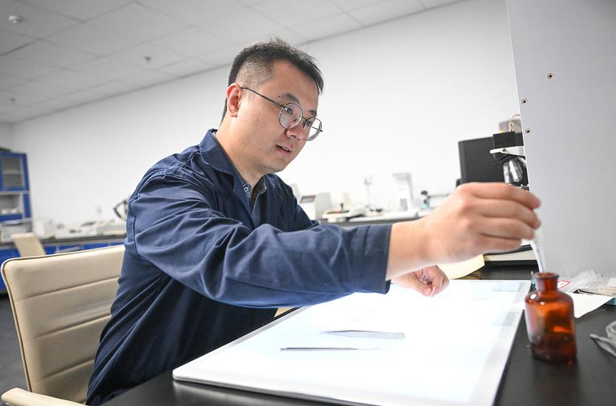 Gao Xuemiao prepares agent for experiment at the laboratory of Tianjin Library in north China's Tianjin Municipality, April 18, 2024. (Xinhua/Sun Fanyue)