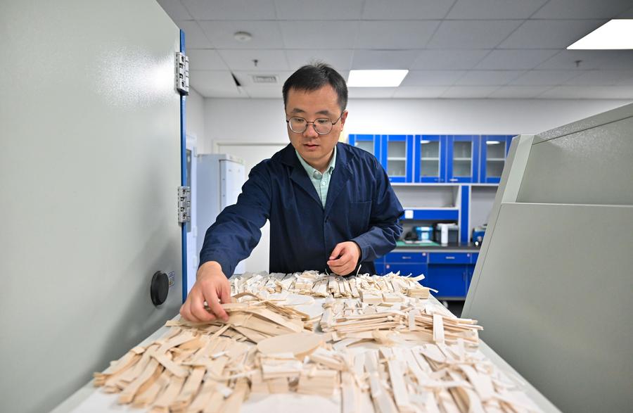 Gao Xuemiao cleans experimental utensils at the laboratory of Tianjin Library in north China's Tianjin Municipality, April 22, 2024. (Xinhua/Sun Fanyue)