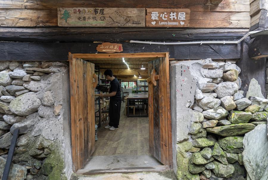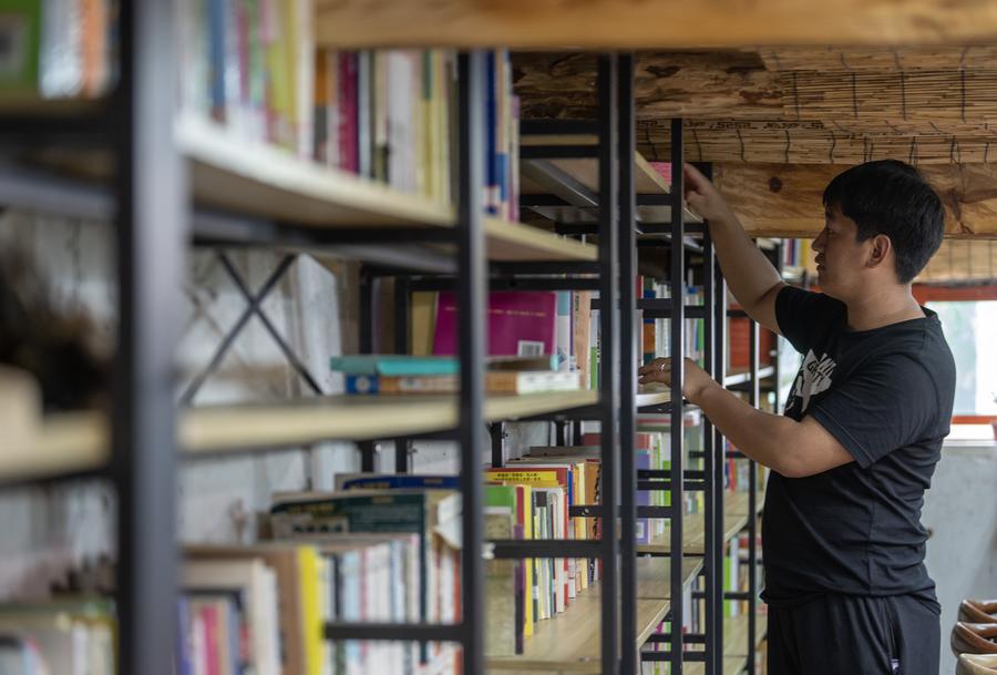Gan Wenyong arranges books at the "Banshan Huayu" library in Qiunatong Village of Bingzhongluo Township in Gongshan Dulong and Nu Autonomous County, Lisu Autonomous Prefecture of Nujiang, southwest China's Yunnan Province, July 5, 2023. (Xinhua/Fei Maohua)