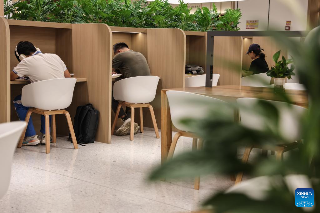 People study at the 24h self-service library of Hainan provincial library in Haikou, south China's Hainan Province, April 23, 2024. Equipped with 128 seats, reading lights and charging devices, a 24h self-service library of Hainan provincial library opened to the public on Tuesday. (Xinhua/Zhang Liyun)