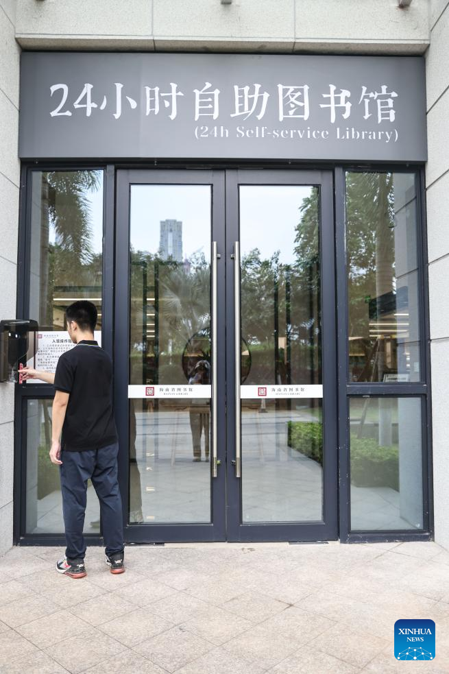 A reader enters the 24h self-service library of Hainan provincial library in Haikou, south China's Hainan Province, April 23, 2024. Equipped with 128 seats, reading lights and charging devices, a 24h self-service library of Hainan provincial library opened to the public on Tuesday. (Xinhua/Zhang Liyun)