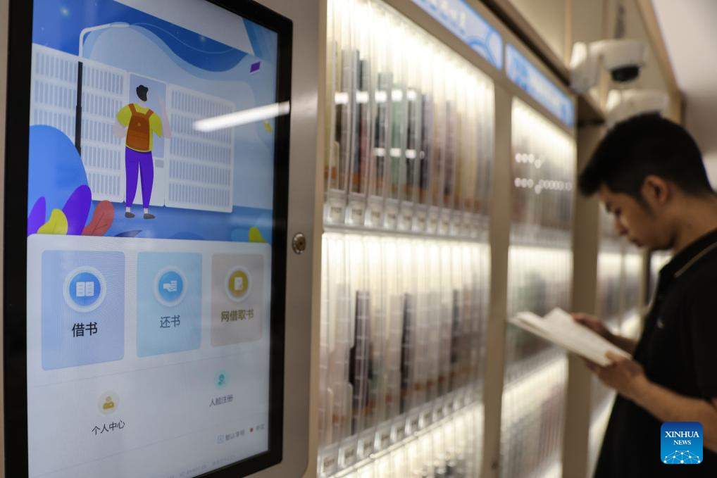 A person reads a book at the 24h self-service library of Hainan provincial library in Haikou, south China's Hainan Province, April 23, 2024. Equipped with 128 seats, reading lights and charging devices, a 24h self-service library of Hainan provincial library opened to the public on Tuesday. (Xinhua/Zhang Liyun)