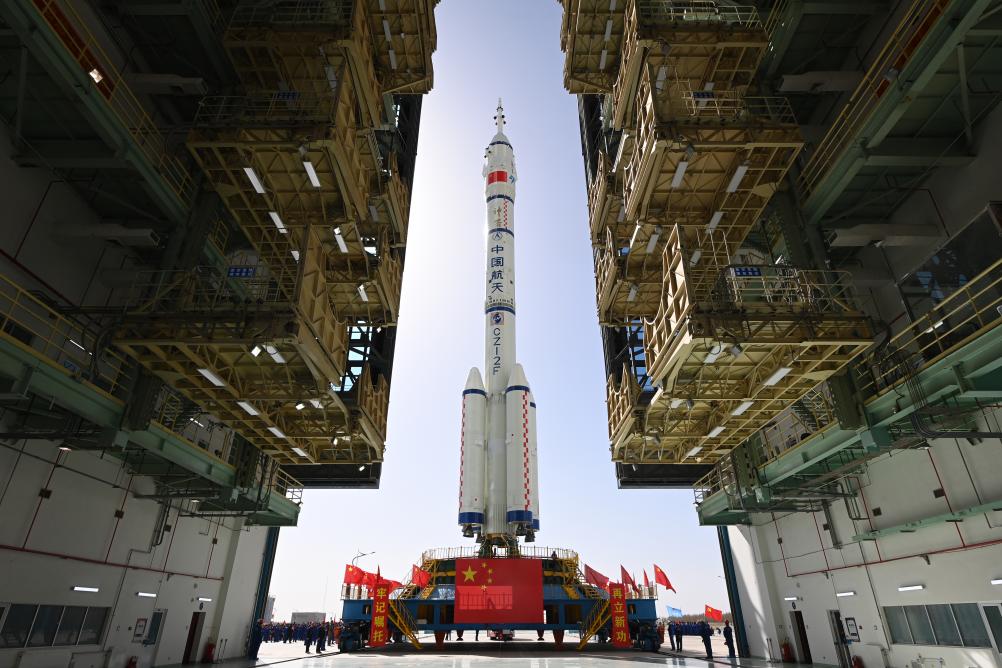 This photo taken on April 17, 2024 shows the combination of the Shenzhou-18 crewed spaceship and a Long March-2F carrier rocket being transferred to the launching area of the Jiuquan Satellite Launch Center in northwest China. (Photo by Wang Jiangbo/Xinhua)