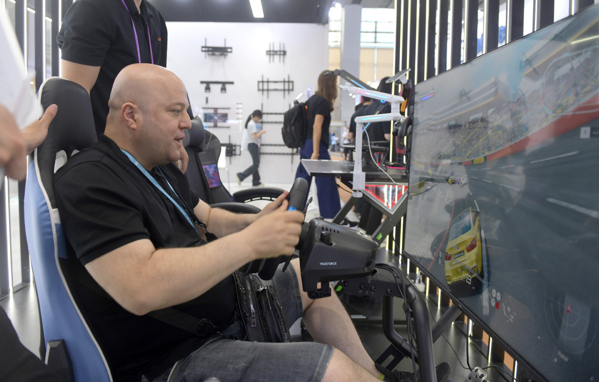 A visitor tries a racing game during the 135th session of the China Import and Export Fair in Guangzhou, South China's Guangdong province, April 15, 2024. [Photo/Xinhua]