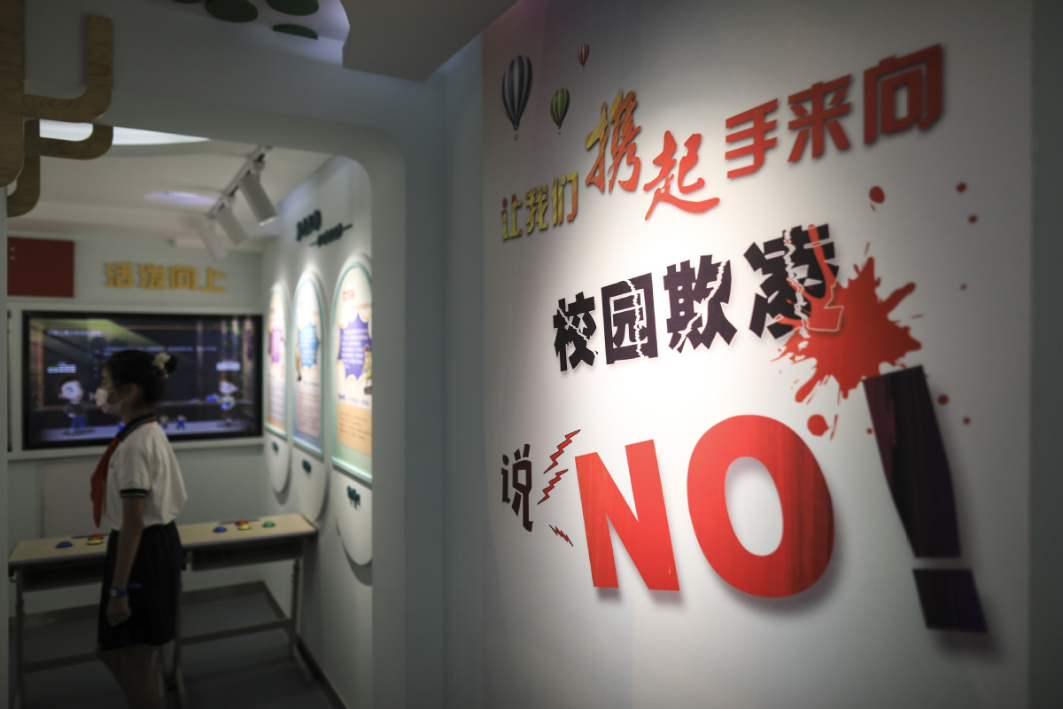 A show is held in Shijingshan district of Beijing to make minors aware of school bullying and other campus problems. The poster on the wall says "Let's join hands to say no to school bullying!" CHINA DAILY