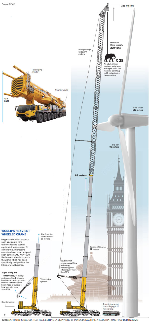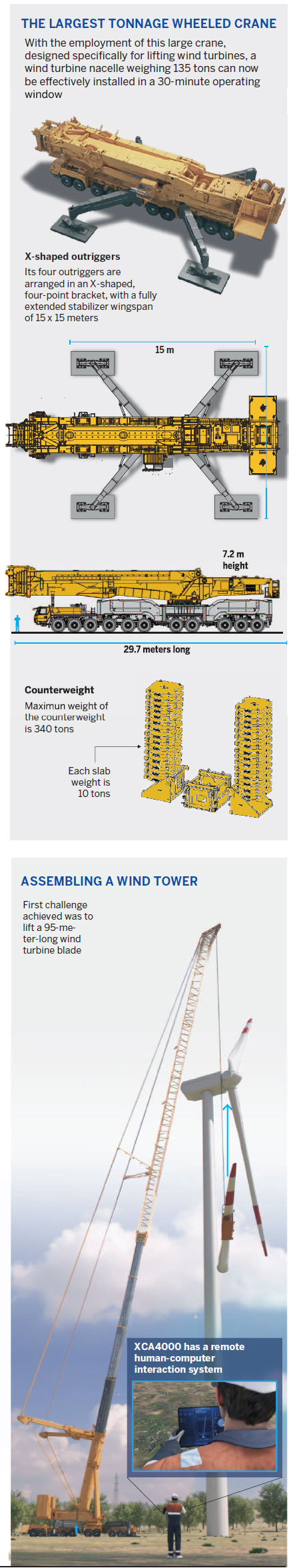 At a 200-megawatt wind farm in Hengshui, Hebei province, the world's largest tonnage wheeled crane XCA4000 completed its first lift in March, lifting a 130-metric-ton nacelle, a 40-ton hub and three 95-meter-long blades weighing 28 tons each, to a height of 162 meters for assembly on the tower.