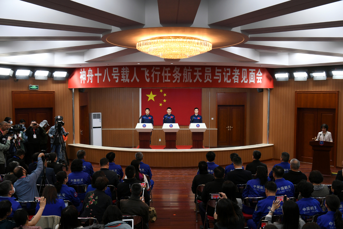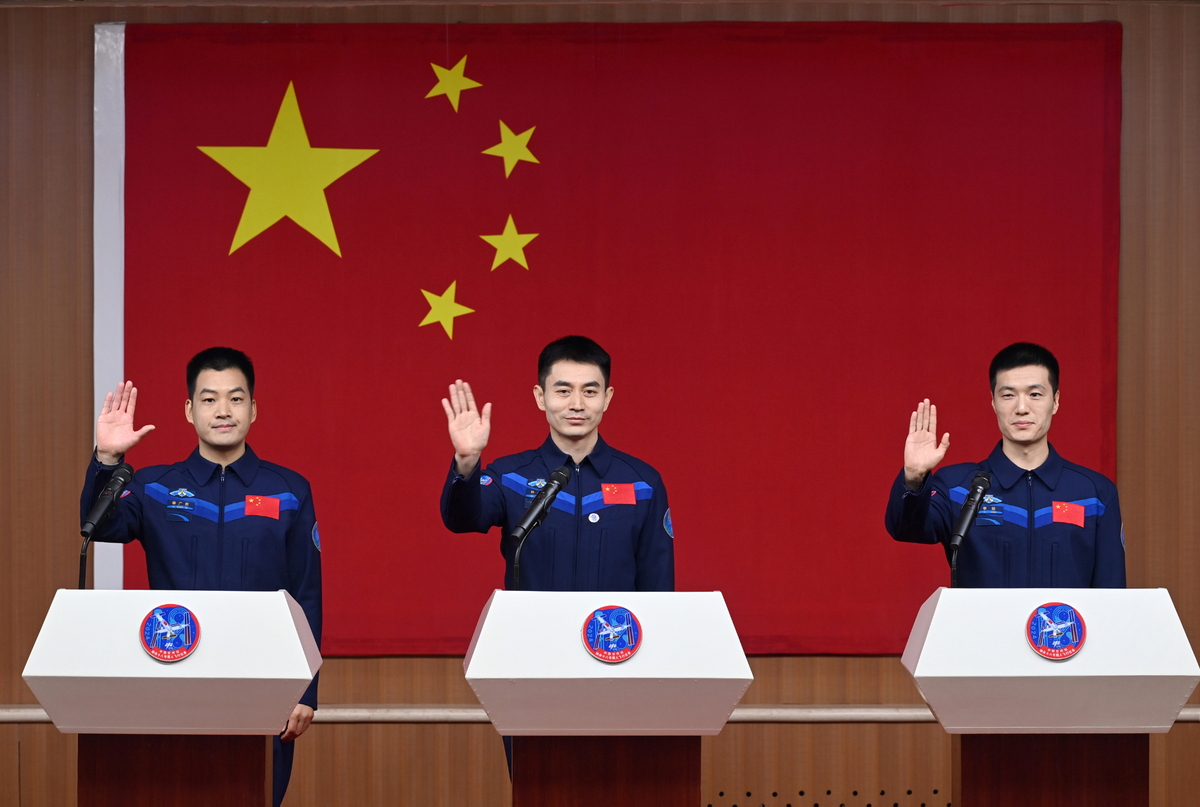 Ye Guangfu, Li Cong and Li Guangsu, the three Chinese astronauts for the upcoming Shenzhou-18 spaceflight mission, meet the press on Wednesday. [Photo by Wang Jiangbo/chinadaily.com.cn]