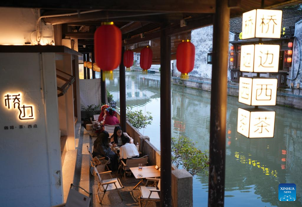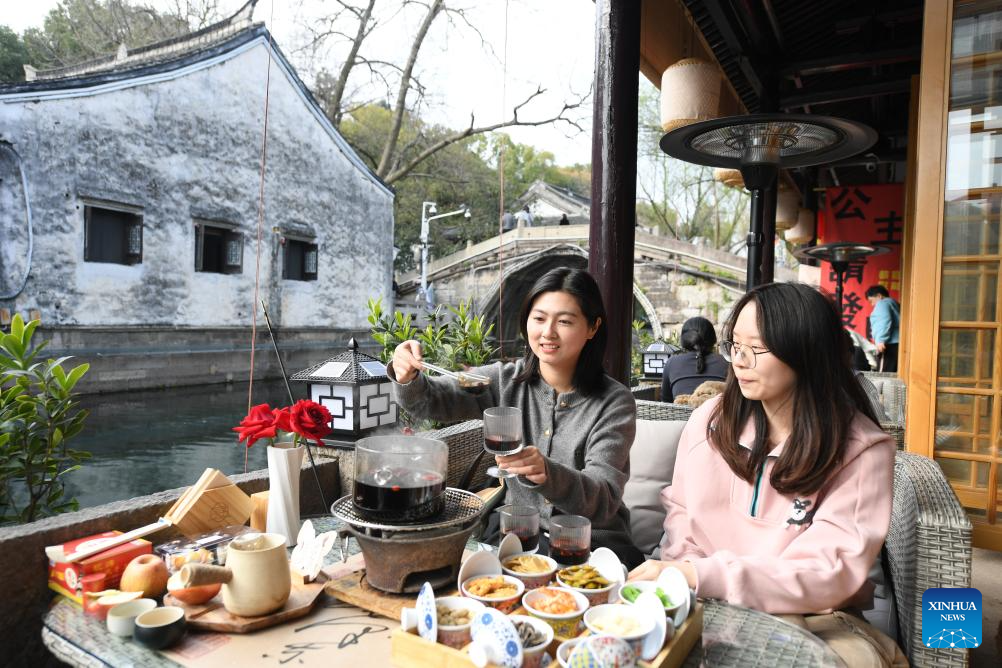 People enjoy their leisure time at a business establishment in Cangqiao Straight Street in Shaoxing, east China's Zhejiang Province, March 13, 2024. (Xinhua/Weng Xinyang)