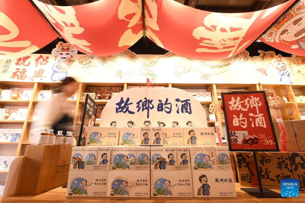 This photo taken on March 13, 2024 shows yellow rice wine at a store in Cangqiao Straight Street in Shaoxing, east China's Zhejiang Province. (Xinhua/Weng Xinyang)