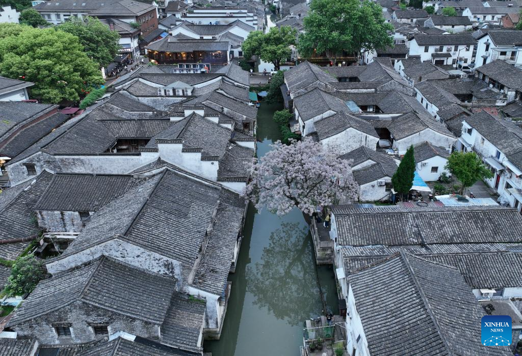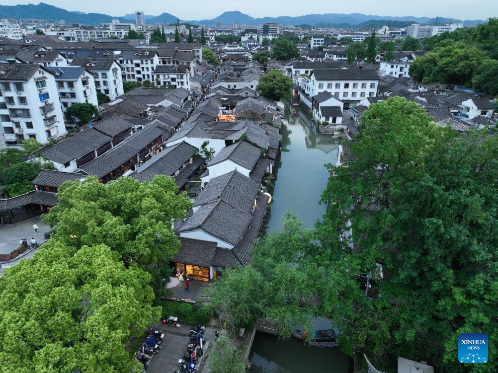 An aerial drone photo taken on April 24, 2024 shows a view of the Cangqiao Straight Street in Shaoxing, east China's Zhejiang Province. (Xinhua/Weng Xinyang)