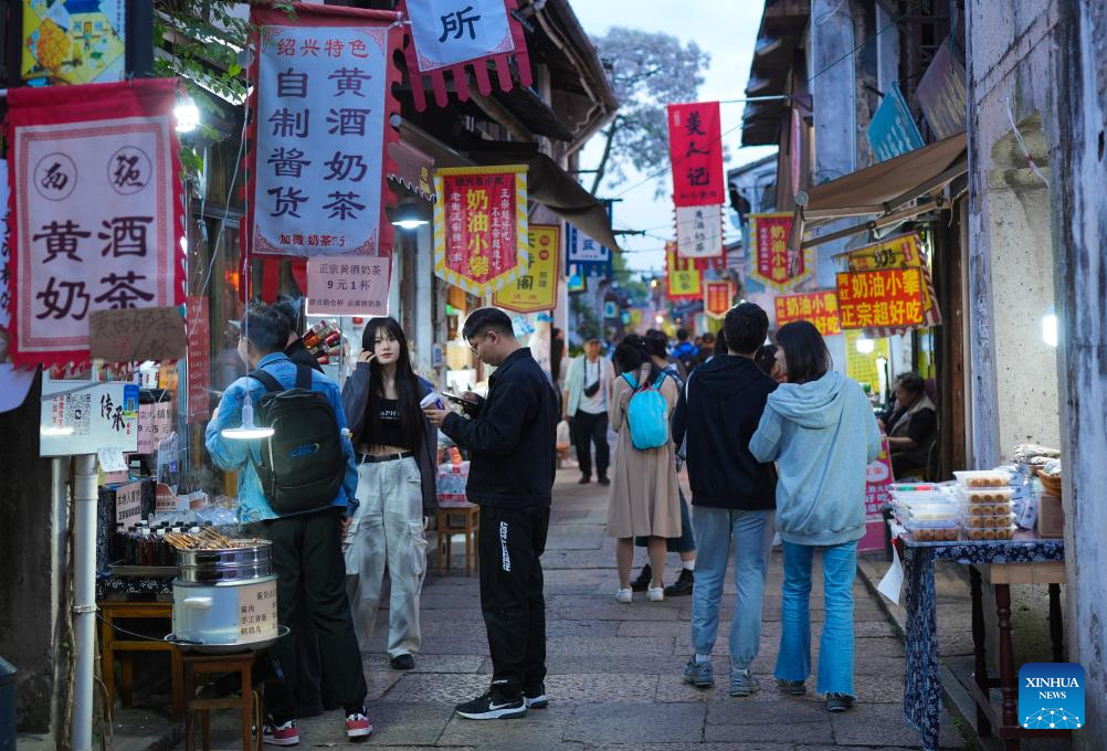 Tourists are pictured at Cangqiao Straight Street in Shaoxing, east China's Zhejiang Province, April 24, 2024. (Xinhua/Weng Xinyang)