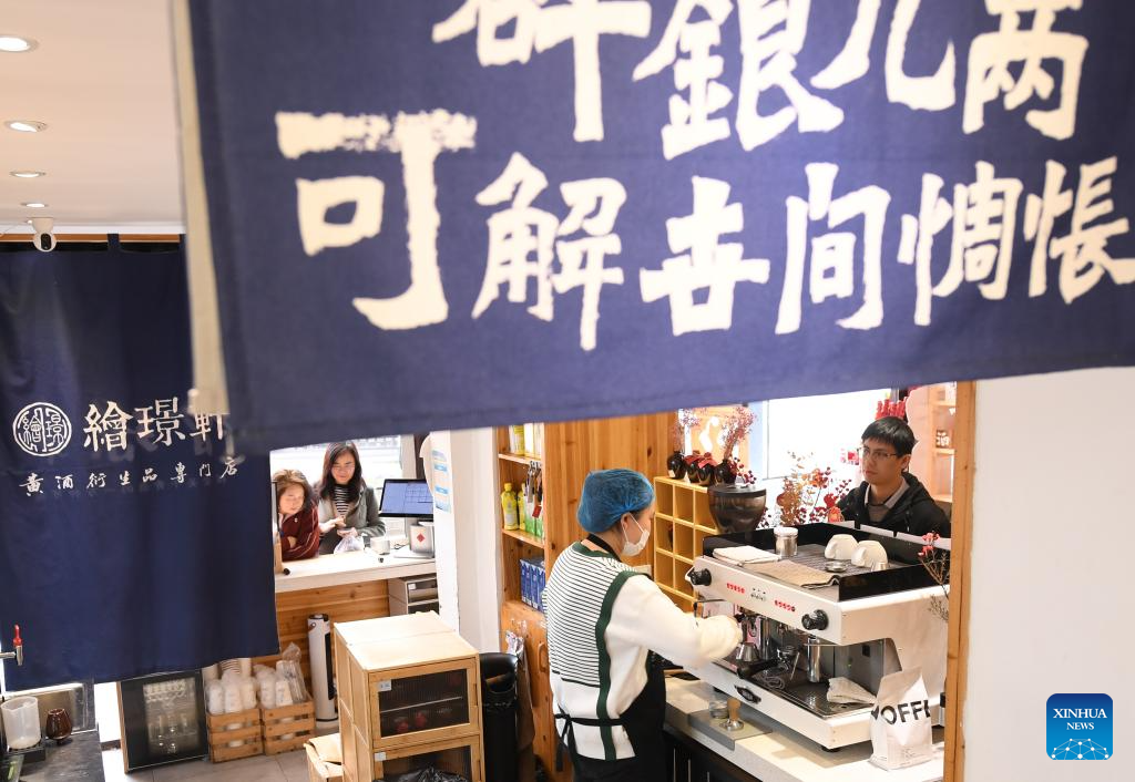 A customer buys specialty coffee flavored with yellow rice wine at a store in Cangqiao Straight Street in Shaoxing, east China's Zhejiang Province, March 13, 2024. (Xinhua/Weng Xinyang)