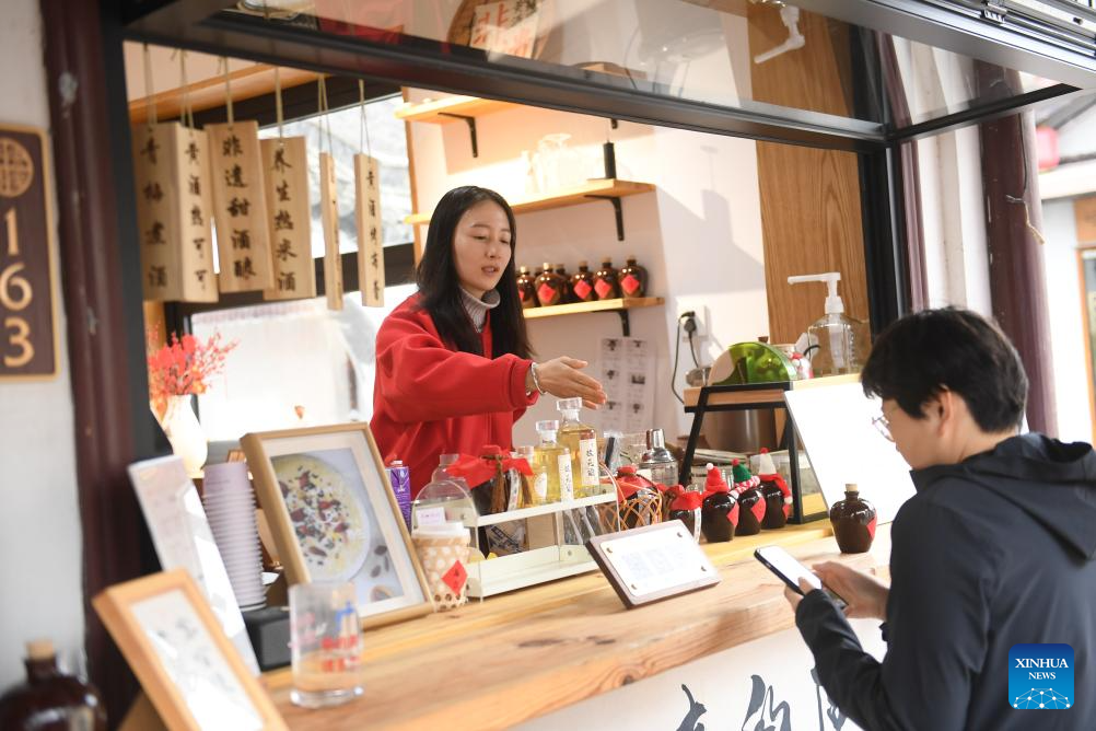 A clerk guides a customer to pay via her mobile phone for specialty coffee flavored with yellow rice wine at a store in Cangqiao Straight Street in Shaoxing, east China's Zhejiang Province, Feb. 20, 2024. (Xinhua/Weng Xinyang)