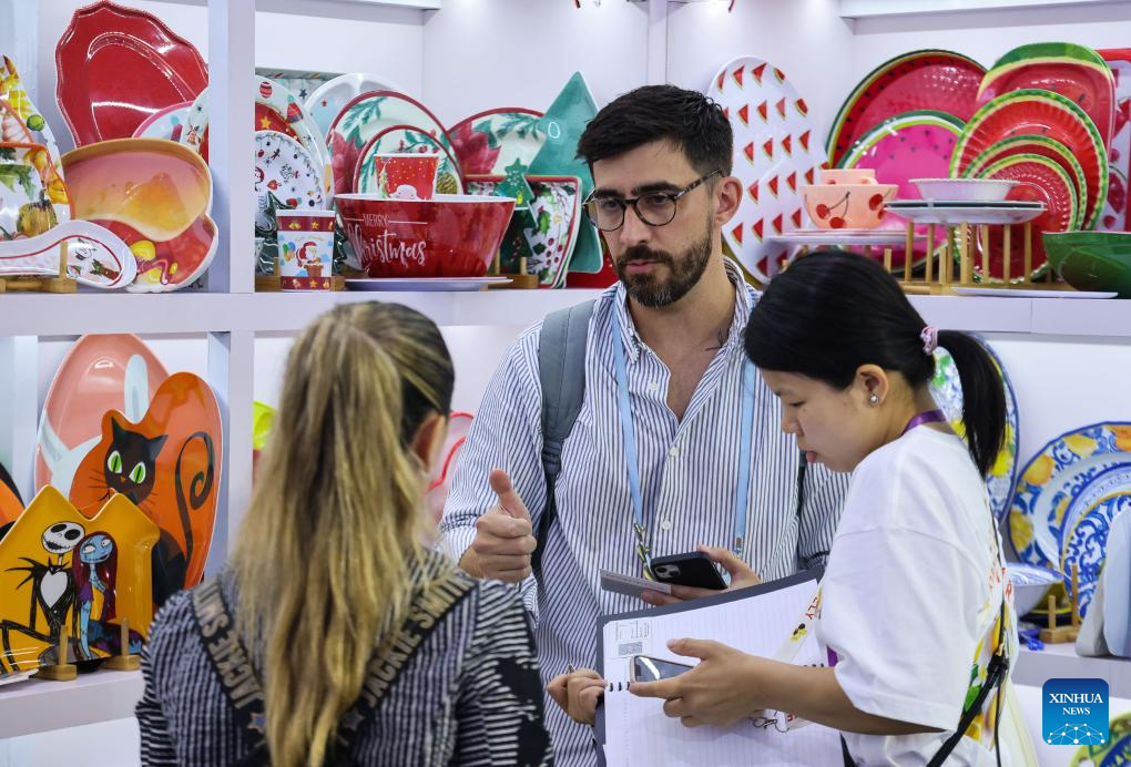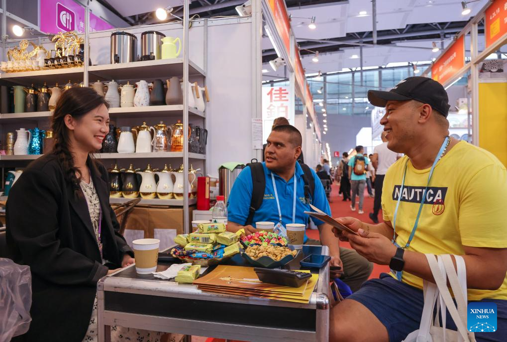 Purchasers from Venezuela (R and C) talk to an exhibitor during the 135th session of the China Import and Export Fair in Guangzhou, south China's Guangdong Province, April 24, 2024. (Xinhua/Liu Dawei)
