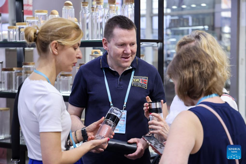Purchasers from Poland learn about exhibits during the 135th session of the China Import and Export Fair in Guangzhou, south China's Guangdong Province, April 24, 2024. (Xinhua/Liu Dawei)