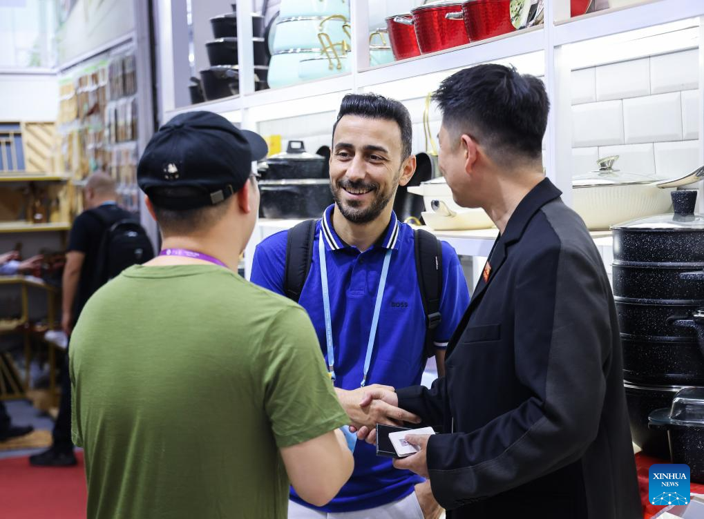 A purchaser from Trkiye (C) talks to exhibitors during the 135th session of the China Import and Export Fair in Guangzhou, south China's Guangdong Province, April 24, 2024. (Xinhua/Liu Dawei)
