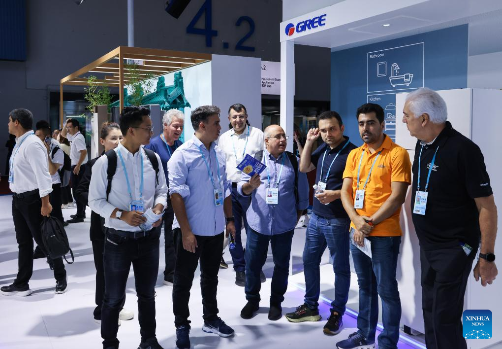 Overseas purchasers learn about smart home appliances at the booth of Gree during the 135th session of the China Import and Export Fair in Guangzhou, south China's Guangdong Province, April 15, 2024. (Xinhua/Liu Dawei)