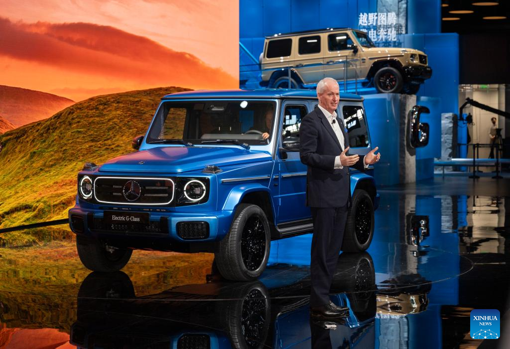 Hubertus Troska, member of the Board of Management of Mercedes-Benz Group AG, unveils the Mercedes-Benz G-Class electric offroad vehicle at the 2024 Beijing International Automotive Exhibition in Shunyi District, Beijing, capital of China, April 25, 2024. The exhibition opened here on Thursday and will last till May 4. (Xinhua/Cai Yang)