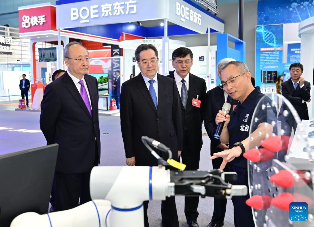 Chinese Vice Premier Ding Xuexiang, also a member of the Standing Committee of the Political Bureau of the Communist Party of China Central Committee, visits an exhibition after addressing the opening ceremony of the 2024 Zhongguancun Forum in Beijing, capital of China, April 25, 2024. (Xinhua/Yue Yuewei)