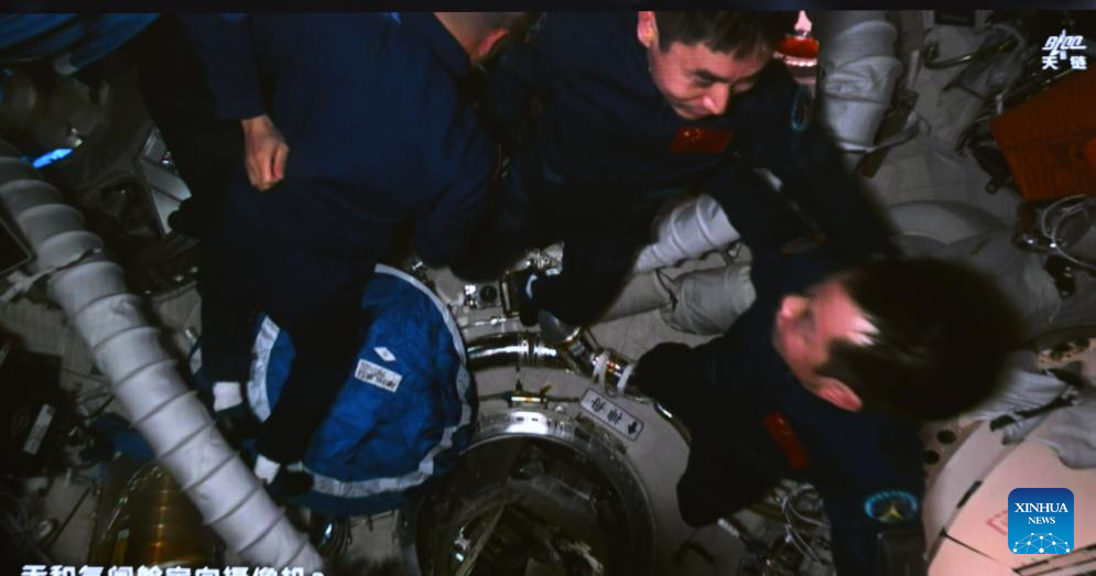 The Shenzhou-17 crew opened the hatch at 5:04 a.m. (Beijing Time). The three space station occupants greeted the new arrivals, and they took group pictures.