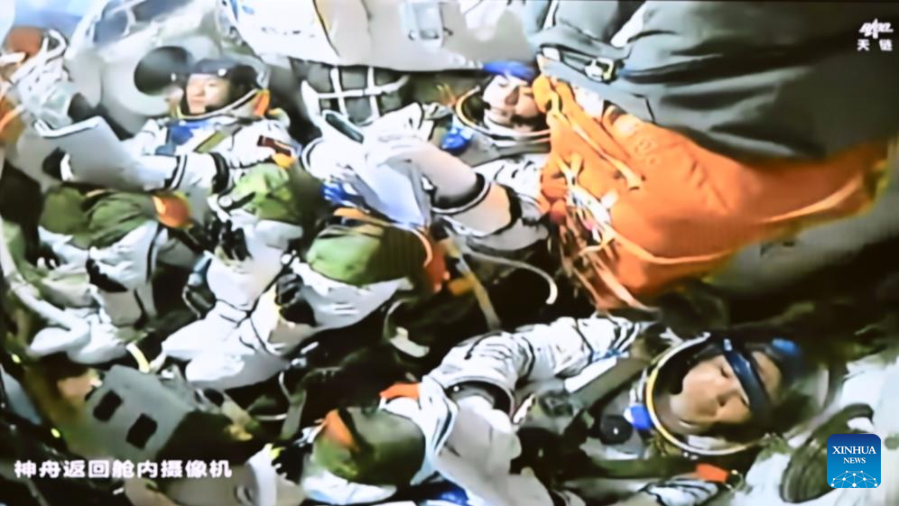 This image captured at Beijing Aerospace Control Center on April 26, 2024 shows the crew of Shenzhou-18 manned spaceship. (Xinhua/Jin Liangkuai)