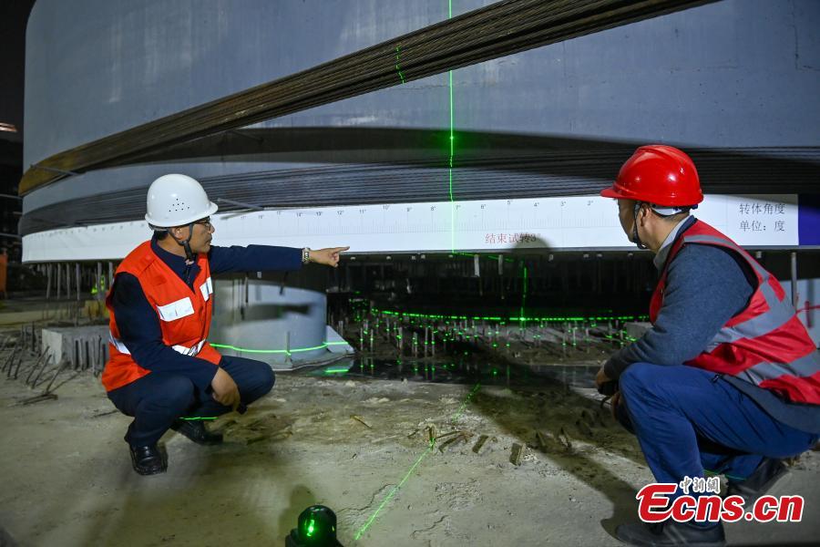 Technicians work at the rotation construction site of a swivel bridge on the Chengdu to Mianyang section of the G5 Beijing-Kunming Expressway after its rotation in Chengdu, southwest China's Sichuan Province, April 24, 2024. (Photo: China News Service/Liu Zhongjun)