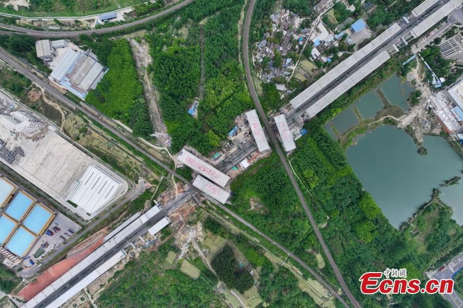 Aerial view of the swivel bridges on the Chengdu to Mianyang section of the G5 Beijing-Kunming Expressway before rotations in Chengdu, southwest China's Sichuan Province, April 24, 2024. (Photo: China News Service/Liu Zhongjun)