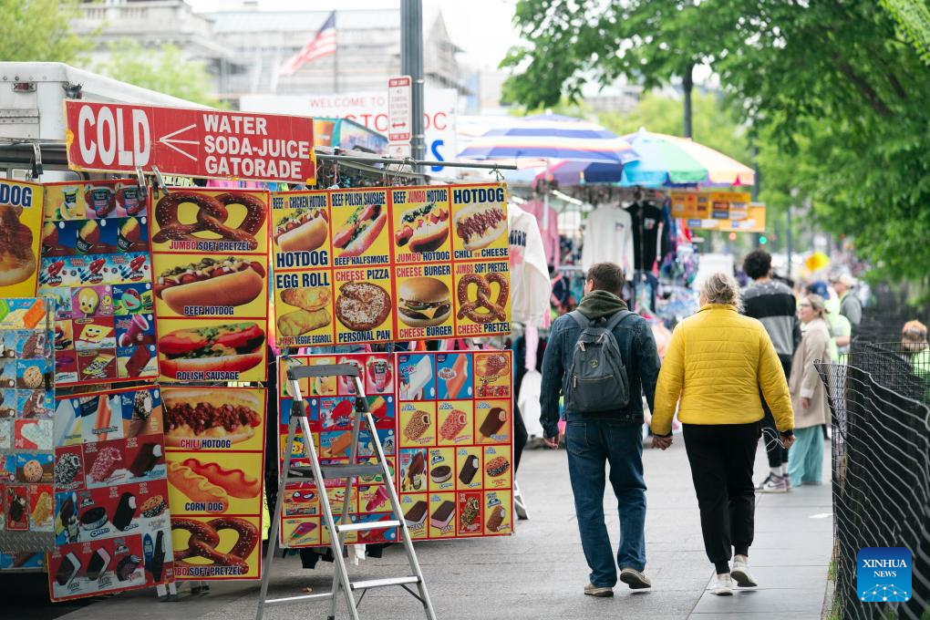 People walk past a food truck in Washington, D.C., the United States, April 25, 2024. The U.S. gross domestic product (GDP) growth rate slowed down to an annual rate of 1.6 percent in the first quarter of this year, the U.S. Department of Commerce reported on Thursday. (Xinhua/Liu Jie)