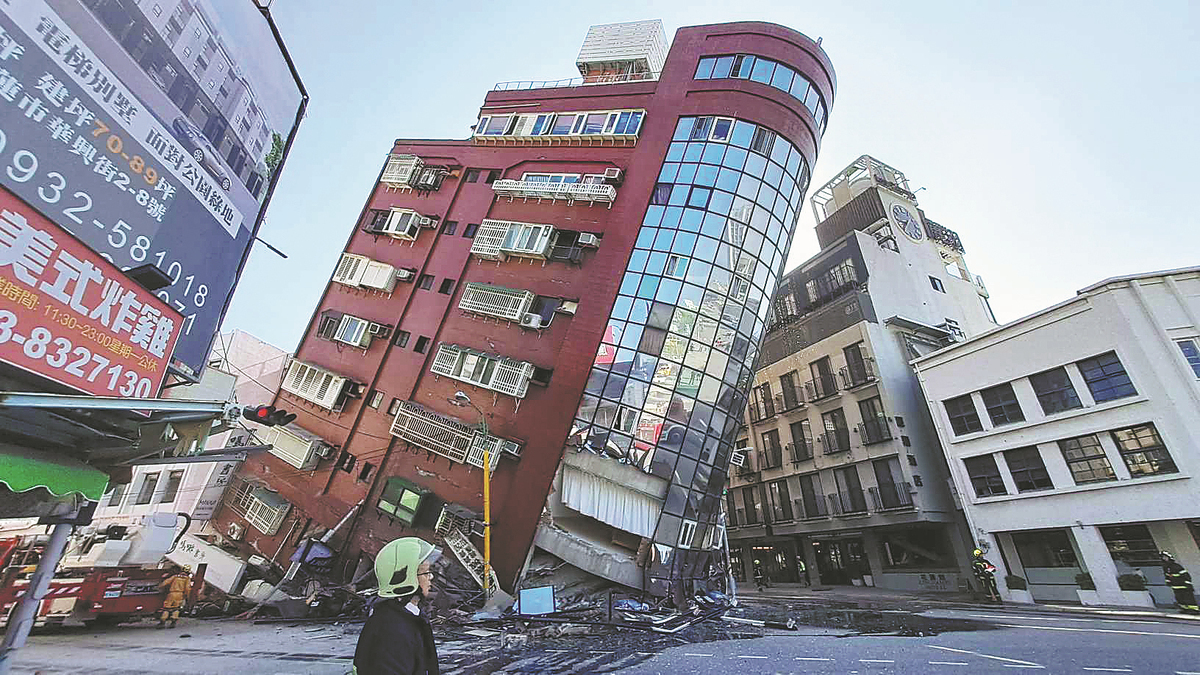 A building leans precariously in downtown Hualien on April 3 following the magnitude 7.3 earthquake in Taiwan. [Photo/China Daily]