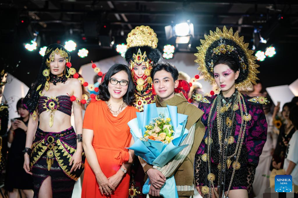 NANNING, April 27 (Xinhua) -- At a graduation show in Guangxi Arts University in Nanning, capital of south China's Guangxi Zhuang Autonomous Region, students stop in their tracks, enthralled by the beauty of five blue and white patchwork outfits that blend Indonesian batik patterns with traditional Chinese Peking Opera elements.