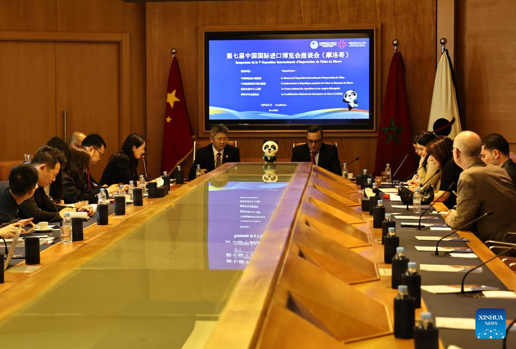 This photo taken on April 26, 2024 shows a symposium promoting the seventh China International Import Expo (CIIE) in Casablanca, Morocco.?(Xinhua/Huo Jing)