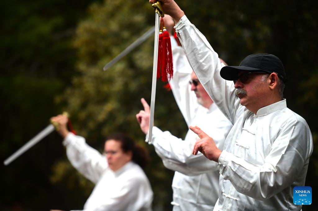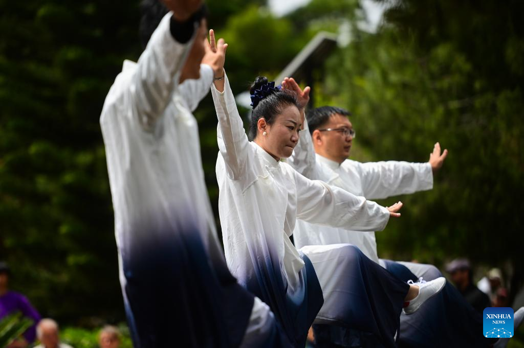 Tai Chi practitioners perform during a Chinese cultural event held at the Chinese Garden of Serenity in Santa Lucija, Malta, on April 27, 2024. (Photo by Jonathan Borg/Xinhua)