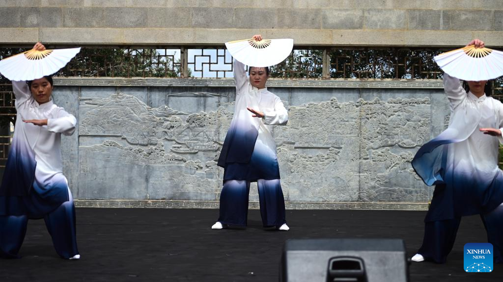 Members of the 19th Chinese medical team from the Mediterranean Regional Centre for Traditional Chinese Medicine (MRCTCM) perform Tai Chi fan during a Chinese cultural event held at the Chinese Garden of Serenity in Santa Lucija, Malta, on April 27, 2024. (Photo by Jonathan Borg/Xinhua)