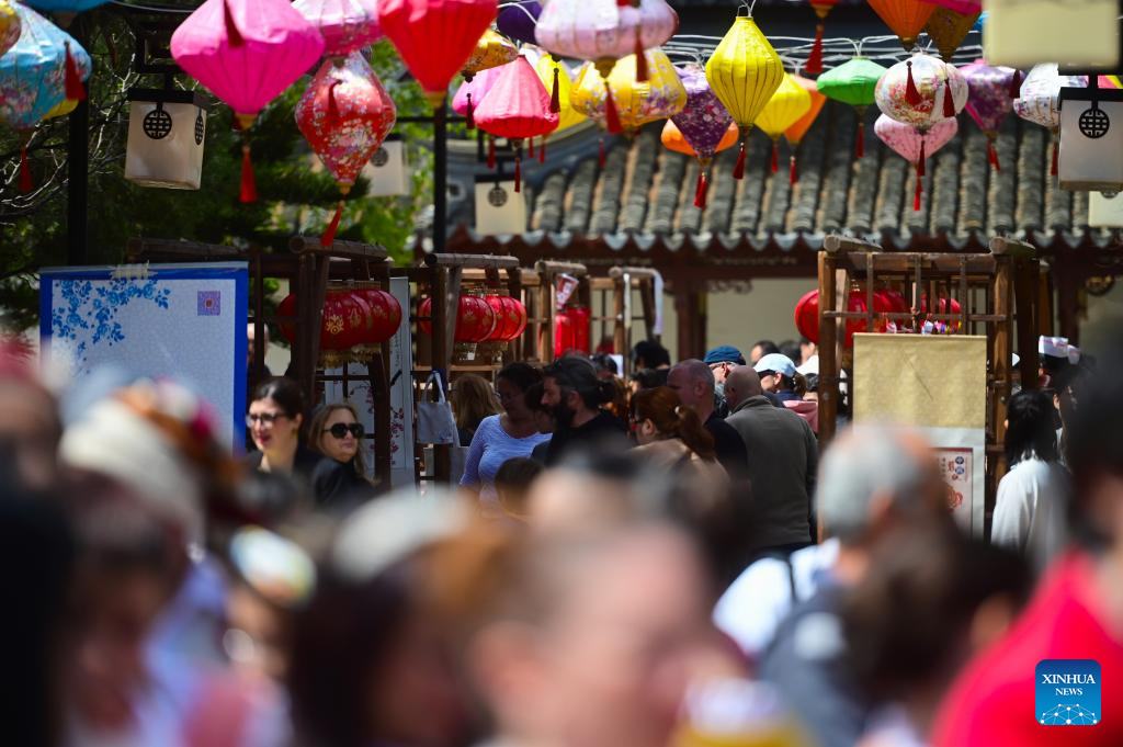 People participate in the Chinese Culture Spring Fair at the Chinese Garden of Serenity in Santa Lucija, Malta, on April 27, 2024. (Photo by Jonathan Borg/Xinhua)