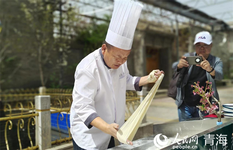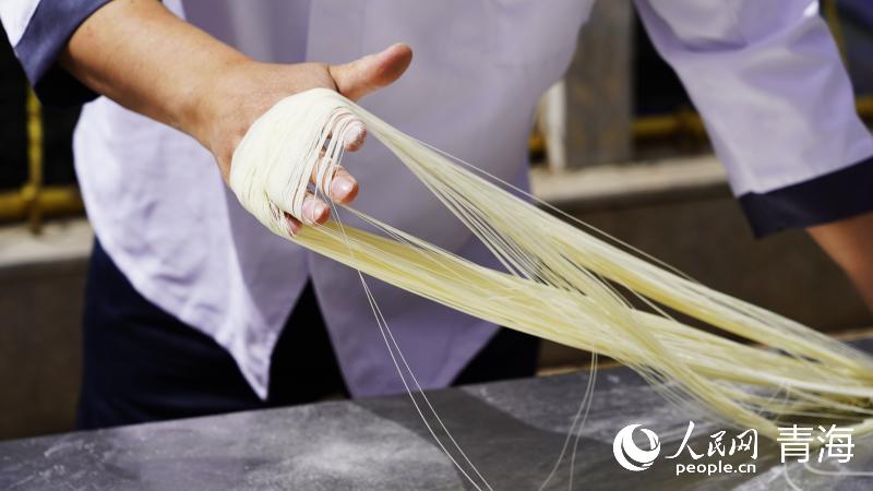 A cook shows off his skills in making lamian noodles thin enough to thread a needle. Lamian noodles are a specialty cuisine in Hualong Hui Autonomous County, Haidong city, northwest China's Qinghai Province. (People's Daily Online/Zhang Liping)