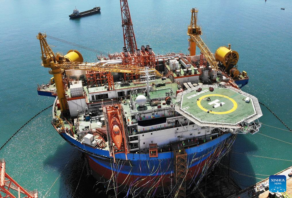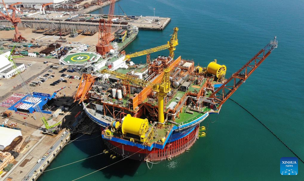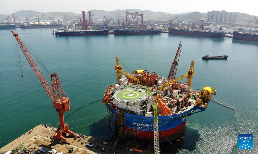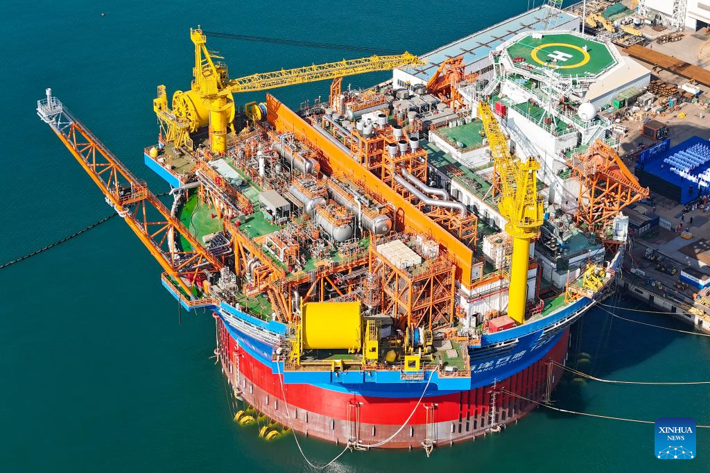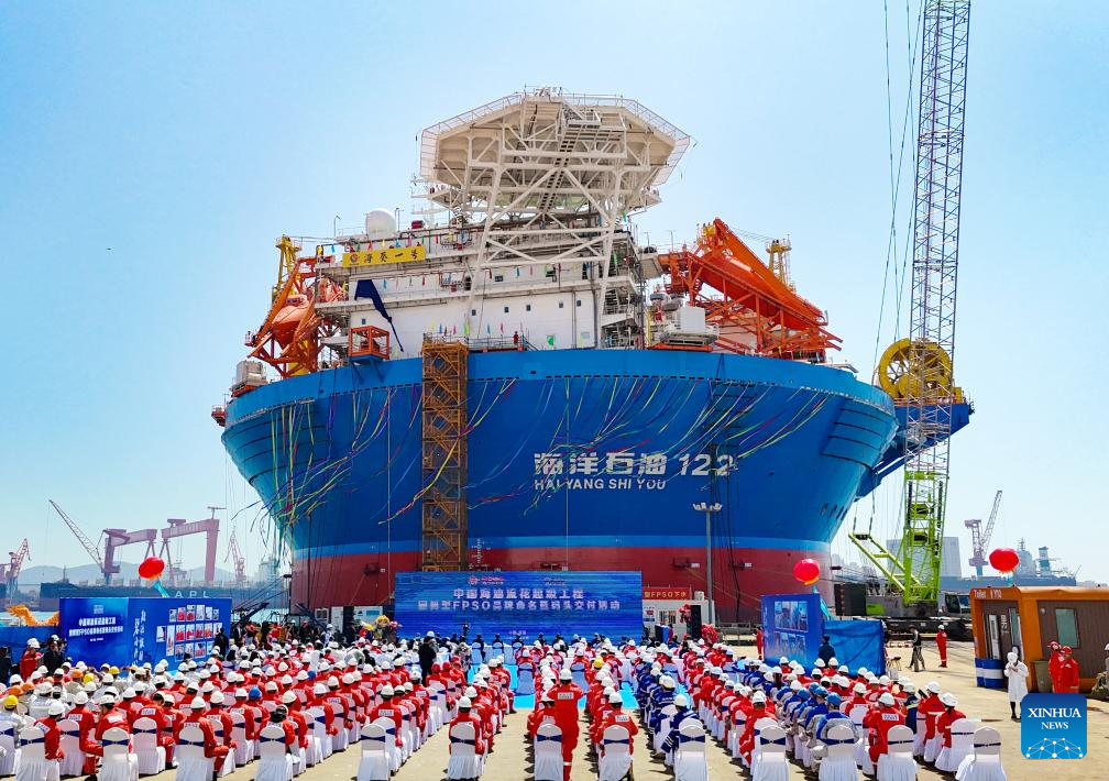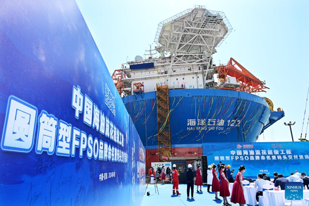 A delivery ceremony of Haikui No. 1, Asia's first cylindrical floating, production, storage, and offloading (FPSO) facility, is held in Qingdao, east China's Shandong Province, April 26, 2024. Designed and built by China, Haikui No. 1 was completed and delivered in Qingdao on Friday. With a maximum displacement of 100,000 tons and storage capacity of 60,000 tons of oil, the facility is capable of operating for 15 years at sea without returning to dock. (Photo by Zhang Jingang/Xinhua)