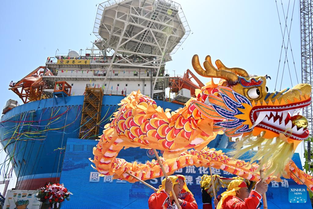 People perform dragon dance at a delivery ceremony of Haikui No. 1, Asia's first cylindrical floating, production, storage, and offloading (FPSO) facility, in Qingdao, east China's Shandong Province, April 26, 2024. Designed and built by China, Haikui No. 1 was completed and delivered in Qingdao on Friday. With a maximum displacement of 100,000 tons and storage capacity of 60,000 tons of oil, the facility is capable of operating for 15 years at sea without returning to dock. (Xinhua/Li Ziheng)