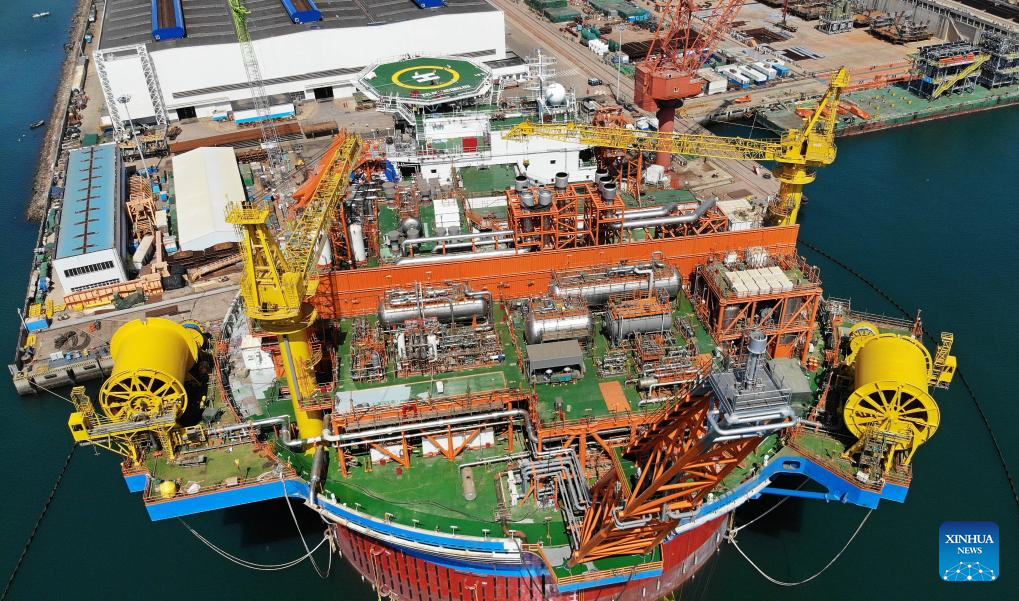 A delivery ceremony of Haikui No. 1, Asia's first cylindrical floating, production, storage, and offloading (FPSO) facility, is held in Qingdao, east China's Shandong Province, April 26, 2024. Designed and built by China, Haikui No. 1 was completed and delivered in Qingdao on Friday. With a maximum displacement of 100,000 tons and storage capacity of 60,000 tons of oil, the facility is capable of operating for 15 years at sea without returning to dock. (Xinhua/Li Ziheng)