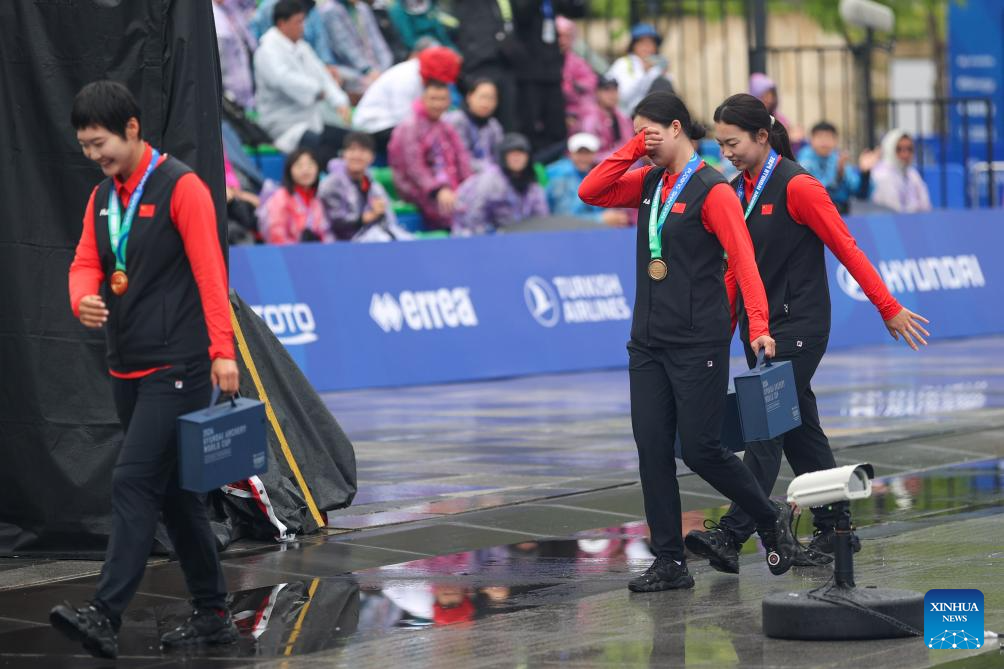 Li Jiaman (C) of team China wipes tears after the awarding ceremony for the Women's Recurve Team event at Shanghai 2024 Archery World Cup Stage 1 in Shanghai, China, April 28, 2024. (Xinhua/Wang Xiang)