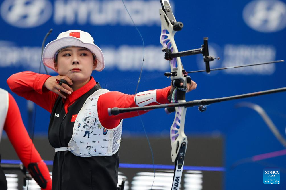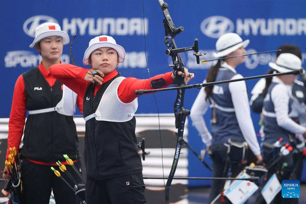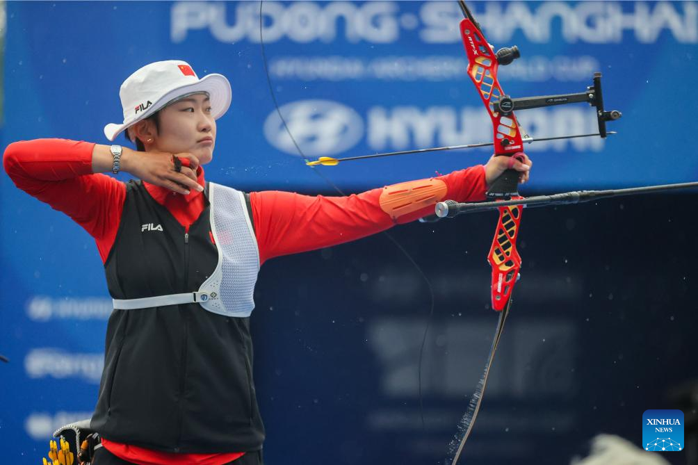 An Qixuan of team China competes during the Women's Recurve Team Final between China and South Korea at Shanghai 2024 Archery World Cup Stage 1 in Shanghai, China, April 28, 2024. (Xinhua/Wang Xiang)