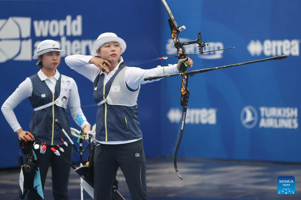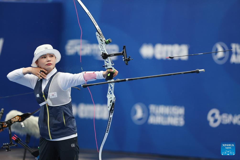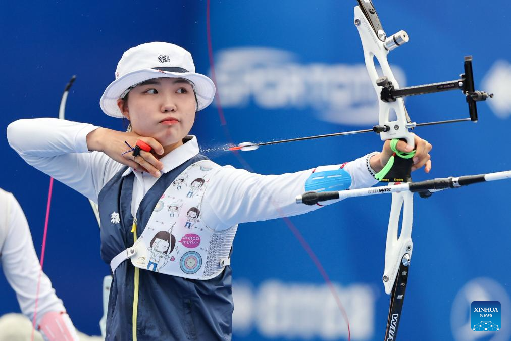 Nam Suhyeon of team South Korea competes during the Women's Recurve Team Final between China and South Korea at Shanghai 2024 Archery World Cup Stage 1 in Shanghai, China, April 28, 2024. (Xinhua/Wang Xiang)
