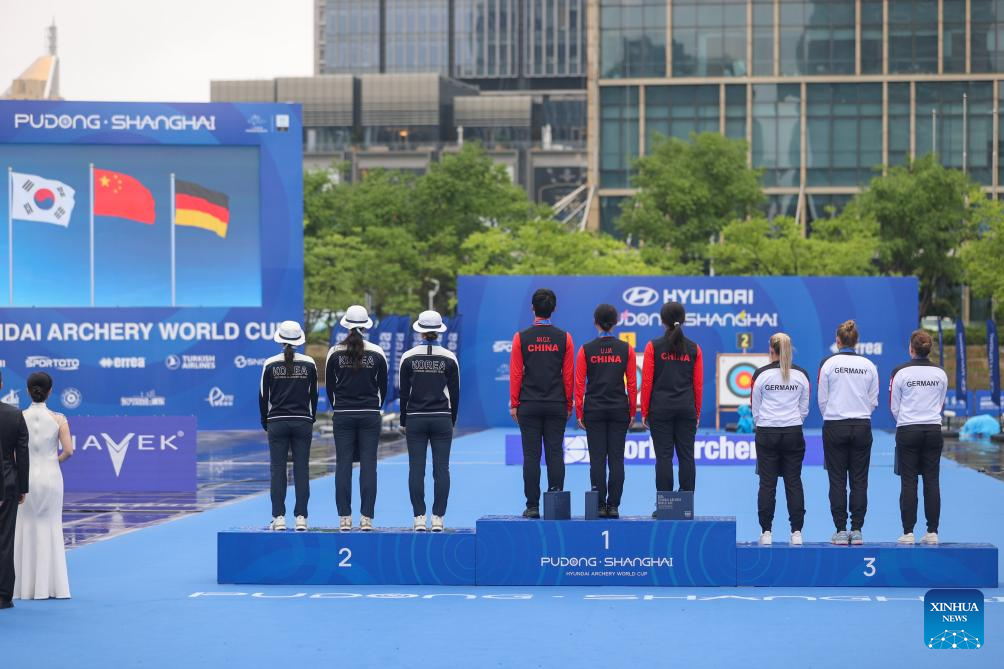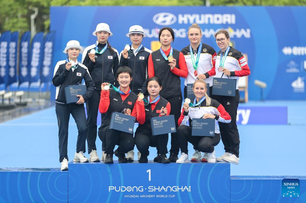 Gold medalists team China (C), silver medalists team South Korea (L) and bronze medalists team Germany stand on the podium during the awarding ceremony for the Women's Recurve Team event at Shanghai 2024 Archery World Cup Stage 1 in Shanghai, China, April 28, 2024. (Xinhua/Wang Xiang)